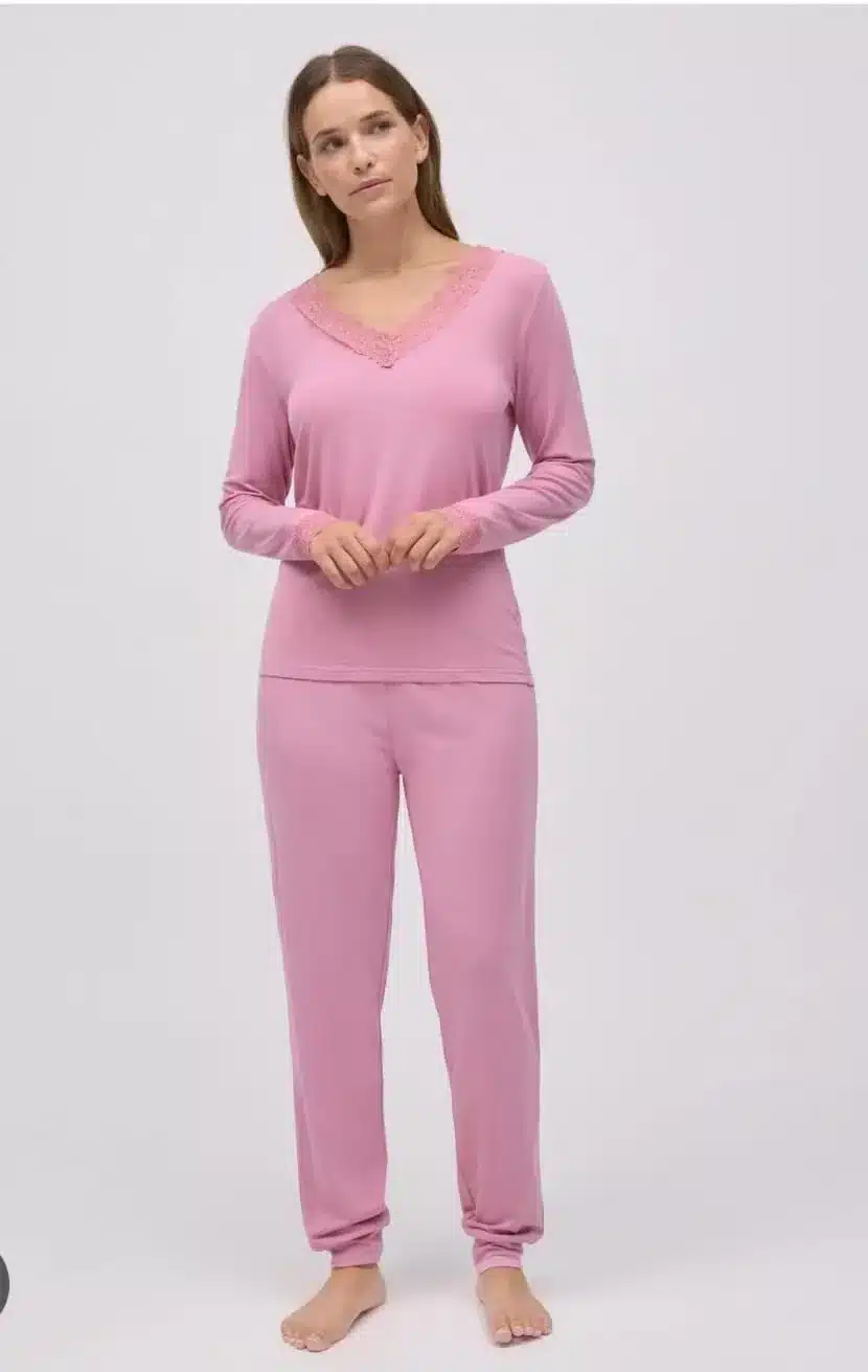 Pijama de senhora em algodão extra macio e confortável. Com acabamentos em renda no decote e nas mangas, é ideal para quem não dispensa a elegância em todos os momentos.